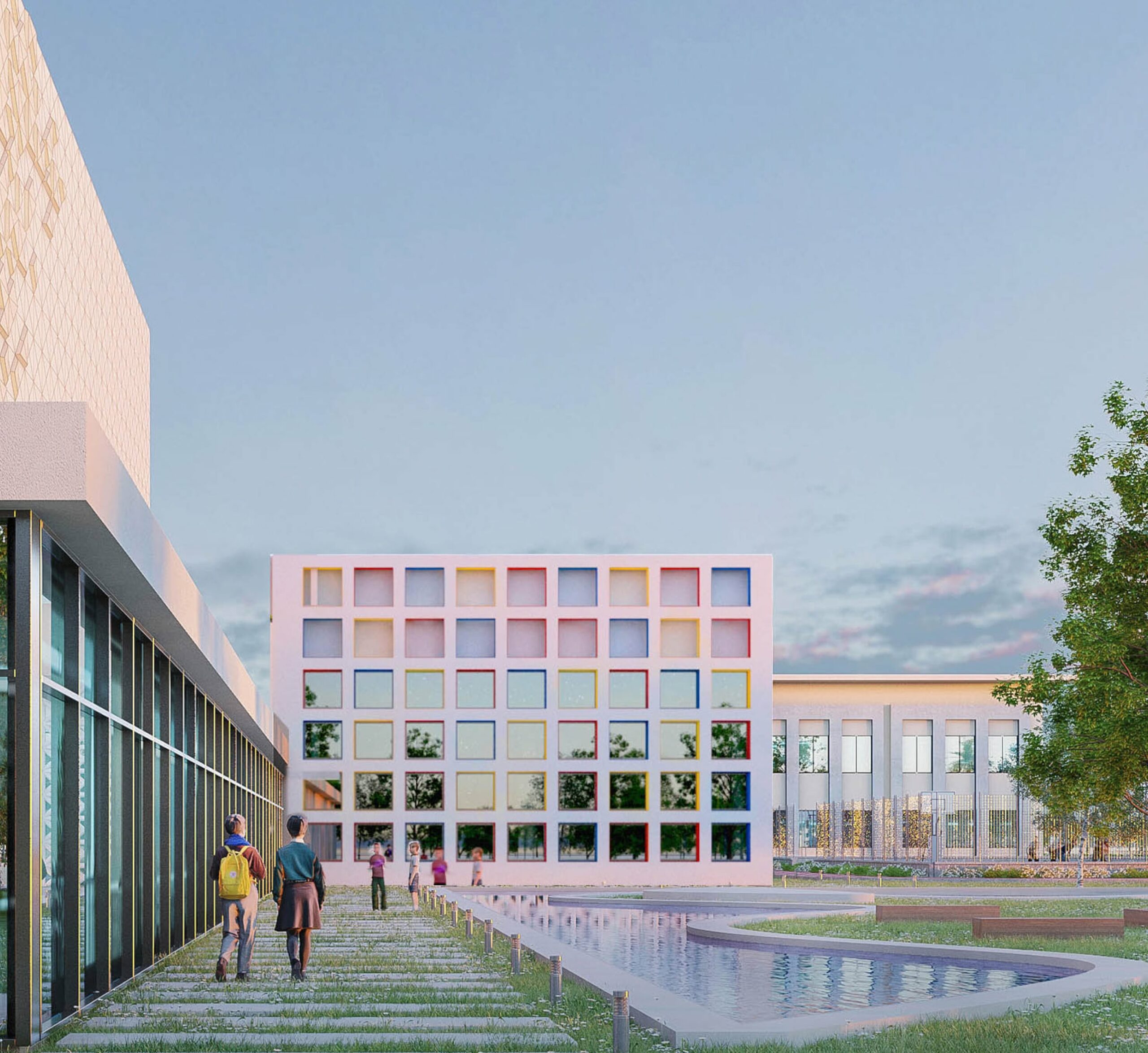 The campus will host a capacity of 1900 students seats divided overall educational levels from kindergarten to college. The design will include a variety of furniture & spatial spaces, both in character and in size, to articulate the positive relationships between new pedagogic methods, community engagement, modern architecture, and educational landscape strategies that promote health, well-being, and collaboration.